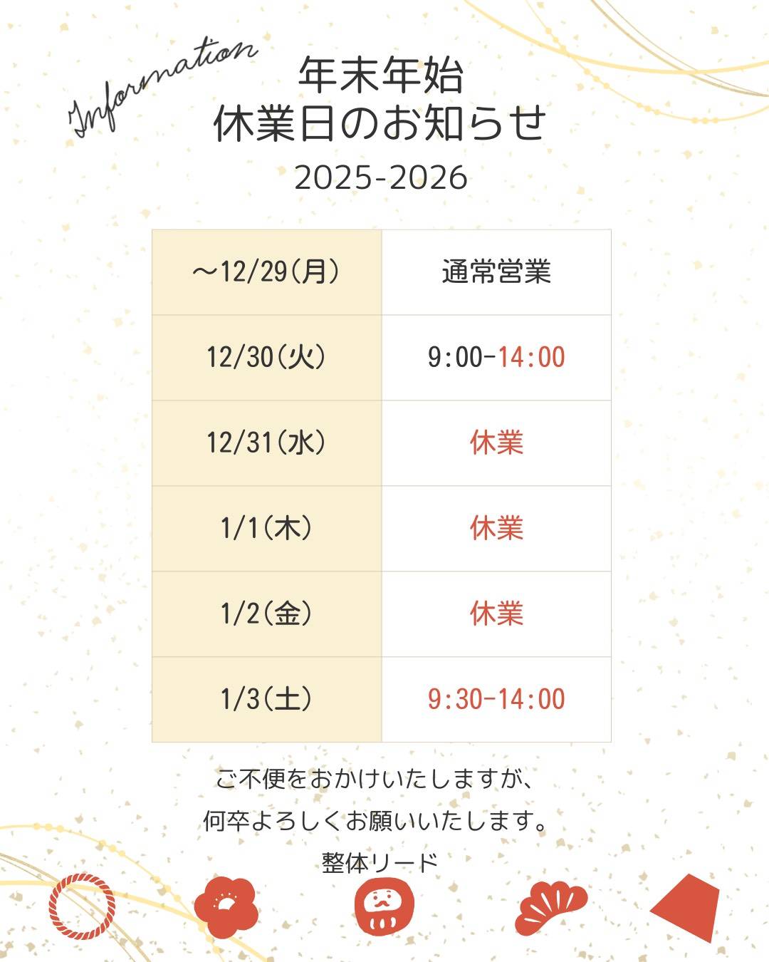 一年頑張ったご自分へのご褒美に整体で身体を整えてリラックスしてお過ごしくださいね^_^